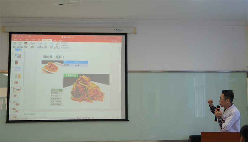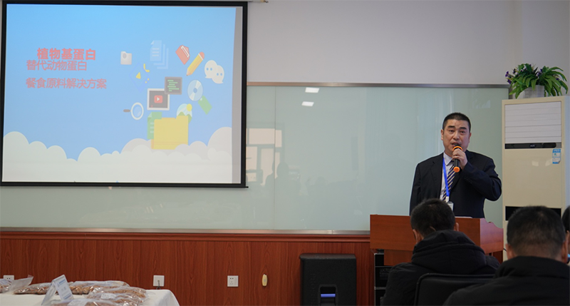 隨后公司技術(shù)部負(fù)責(zé)人蔡昌盛先生就“植物基蛋白餐食原料”為當(dāng)代社會(huì)健康飲食浪潮帶來的市場(chǎng)發(fā)展?jié)摿ψ隽岁U述,并就植物蛋白基的營(yíng)養(yǎng)價(jià)值以及代替動(dòng)物蛋白餐食半成品原料的應(yīng)用等方面做了形象的展示。